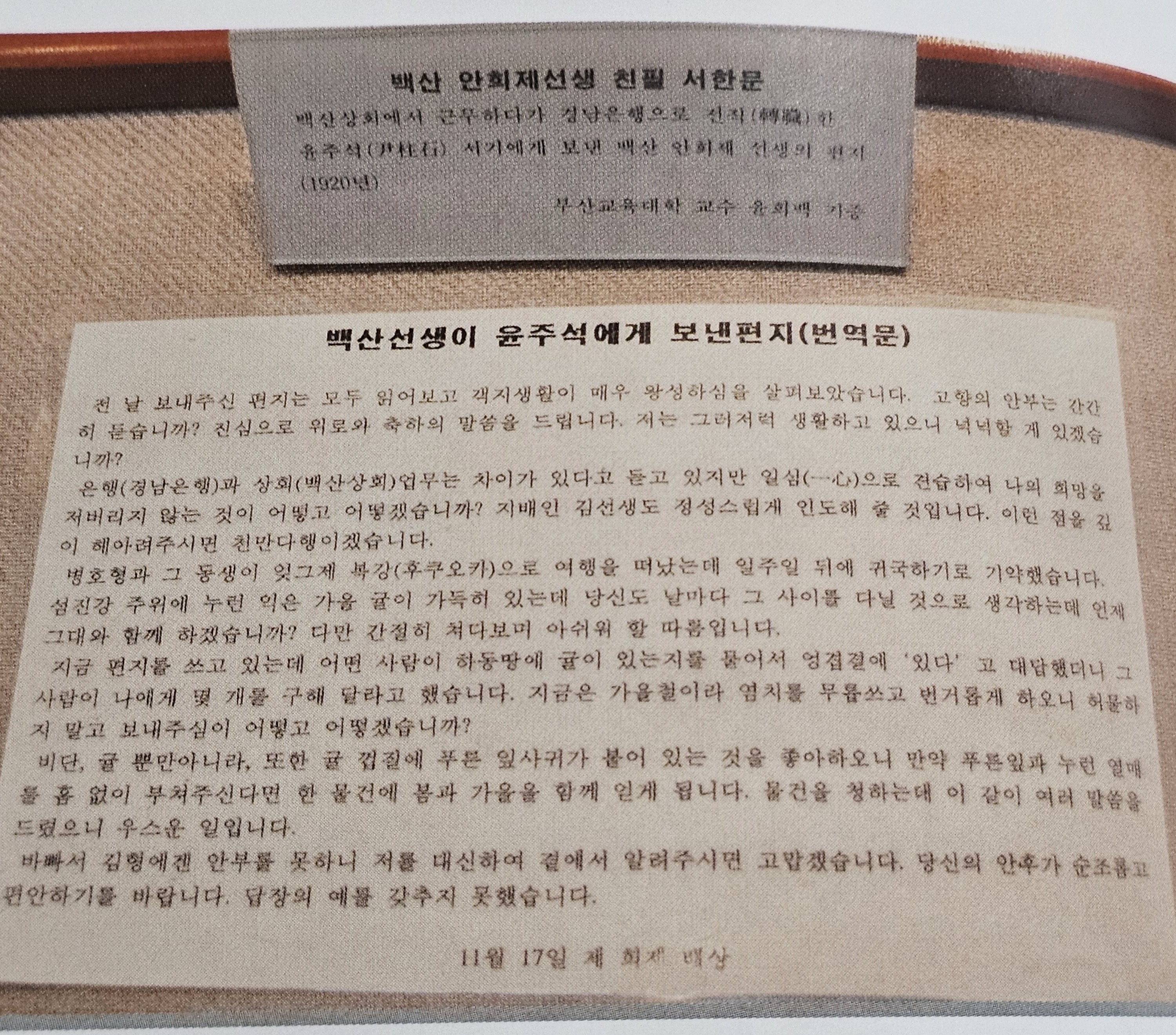 "은행(경남은행)과 상회(백산상회) 업무는 차이가 있다고 듣고 있지만 일심으로 견습하여 나의 희망을 저버리지 않는 것이 어떻고 어떻겠습니까? 지배인 김선생도 정성스럽게 인도해 줄 것입니다. 이런 점을 깊이 헤아려주시면 천만다행이겠습니다."