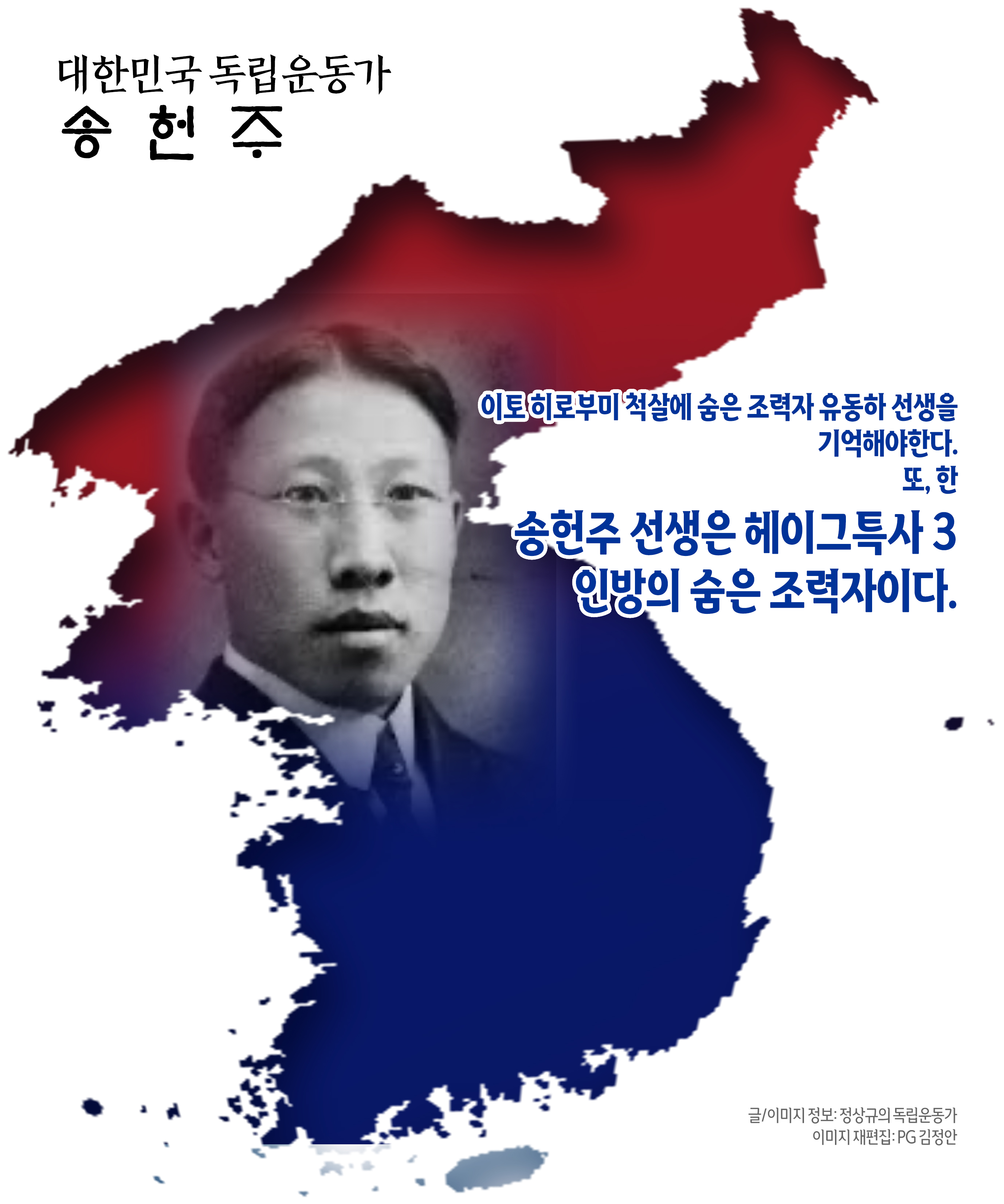 송헌주 선생은 우리에게 잘 알려져 있지 않은 독립운동가이다. 처음 독립운동가 잊혀진 영웅들을 작업할때 안중근만 기억되서는 안된다. 이토 히로부미 척살에 숨은 조력자 유동하 선생을 기억해야한다고 주변에 말했었는데 송헌주 선생은 거의 같은 논리로 헤이그특사 3인방의 숨은 조력자라고 생각하면 된다.