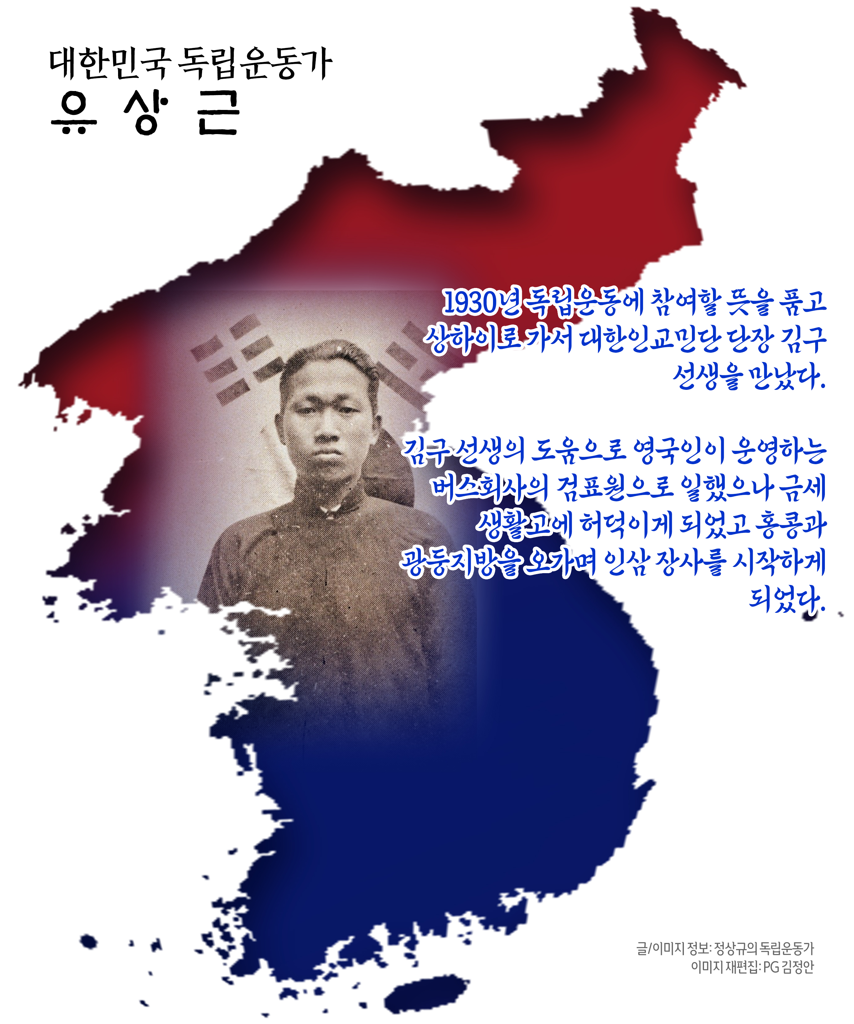 1930년 독립운동에 참여할 뜻을 품고 상하이로 가서 대한인교민단 단장 김구 선생을 만났다.